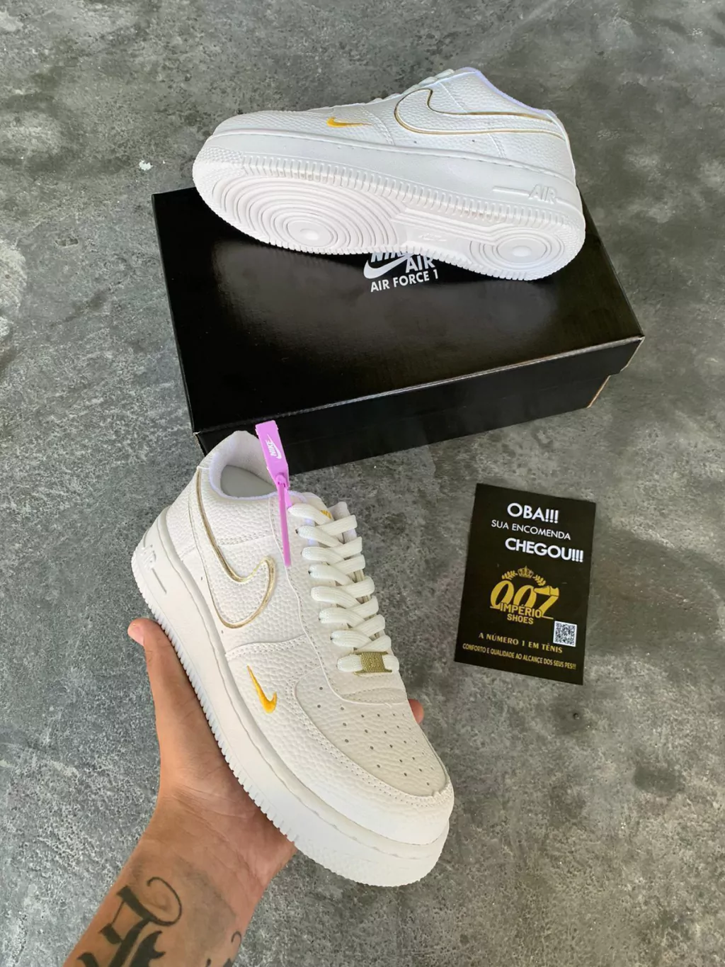 - MODELO AIR FORCE 1, TODO EM COURINO, SOLADO EM BORRACHA, ACOMPANHA PLAQUINHA AF1 E CADARÇO EM ELASTANO;